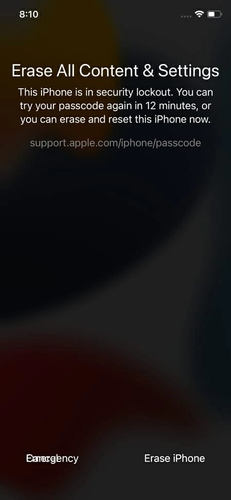 - 当您的 iPhone 运行 iOS 15.2 或更高版本时,如果显示“iPhone 不可用,请在 15 分钟后重试”,您将可以选择从锁定屏幕擦除并重置您的 iPhone。