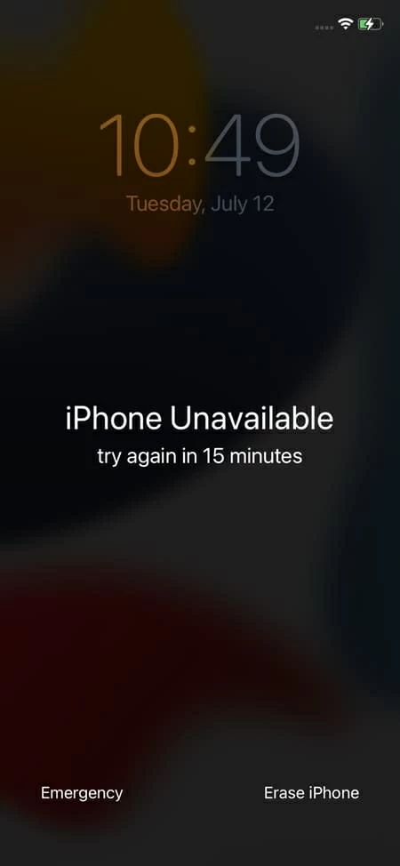 连续输入多次错误的密码后,您的 iPhone 锁定屏幕上会显示“iPhone 不可用”消息。如果尝试六次错误,则会出现“iPhone 不可用,请在 1 分钟内重试”警报。如果您继续尝试但未能解锁,您将看到“iPhone 不可用,请在 5 分钟后重试”。然后,第八次尝试 15 分钟,第十次尝试 1 小时。如果此后您无法输入正确的密码,您的 iPhone 将完全将您锁定。您别无选择,只能完全恢复出厂设置才能重新获得访问权限。