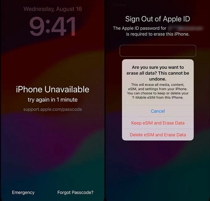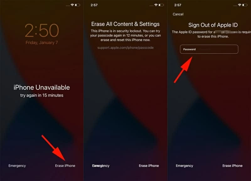 一旦正确设置了所有内容,擦除iPhone选项应在多个错误的密封码之后出现在iPhone屏幕上,从而使您可以通过直接的出厂重置重新获得访问权限。