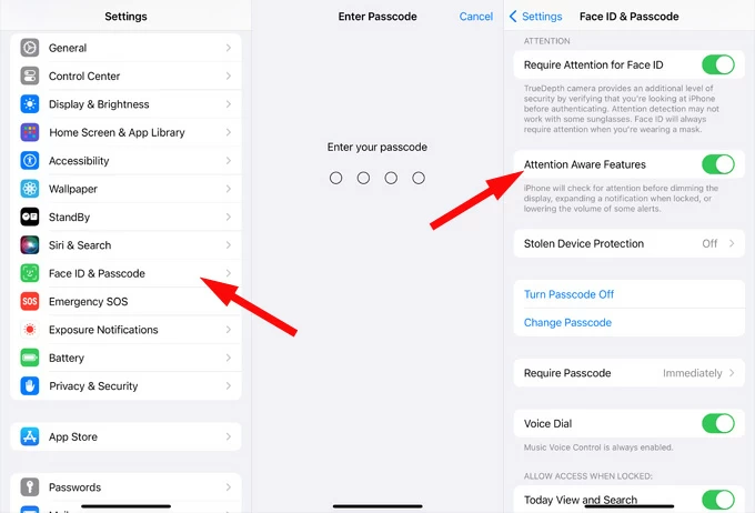 - 向下滚动到“注意”部分并关闭注意力感知功能。