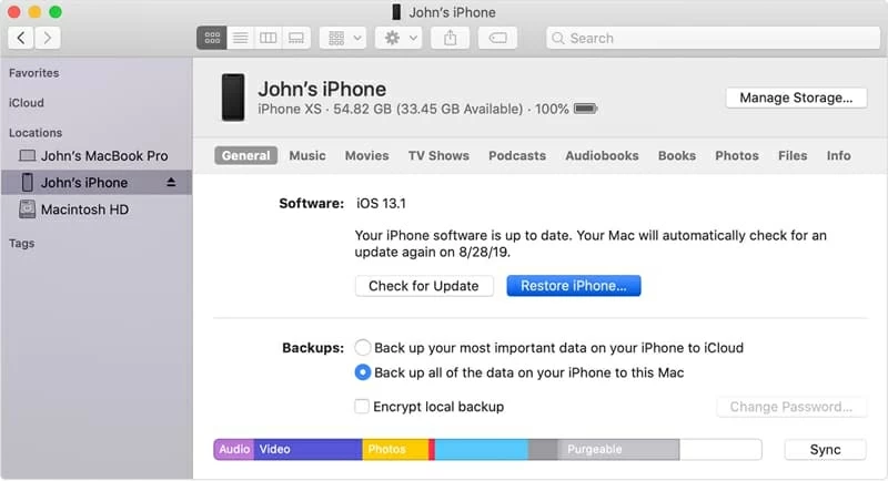 现在,在电脑中打开 iTunes(或 Finder),并将 iPhone XS (Max) 连接到机器。如果 iTunes 可以检测到您卡住的设备,请单击设备图标,然后点击“恢复 iPhone...”按钮。