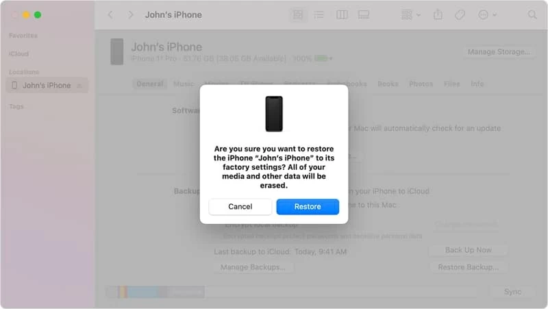 返回 iTunes(或 Finder),然后从弹出的对话框中选择“恢复”。它将开始将您的设备恢复出厂设置,然后下载并安装最新的 iOS 软件。