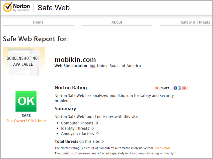 我们将MobileKin.com提交给Norton和McAfee进行网站安全测试。下面是这两位著名病毒检测专家的报告。