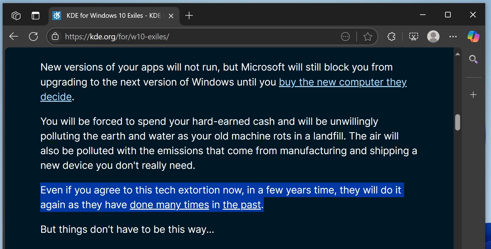 KDE 的竞选活动微软称搭载 Windows 10 的 PC 为“祝酒”,并声称微软希望将该操作系统变成“垃圾”。这不是我编造的。它直接来自 KDE 组织的网站 (kde.org/for/w10-exiles/),他们甚至制作了一张显示 Windows PC 处于过时状态的图像。