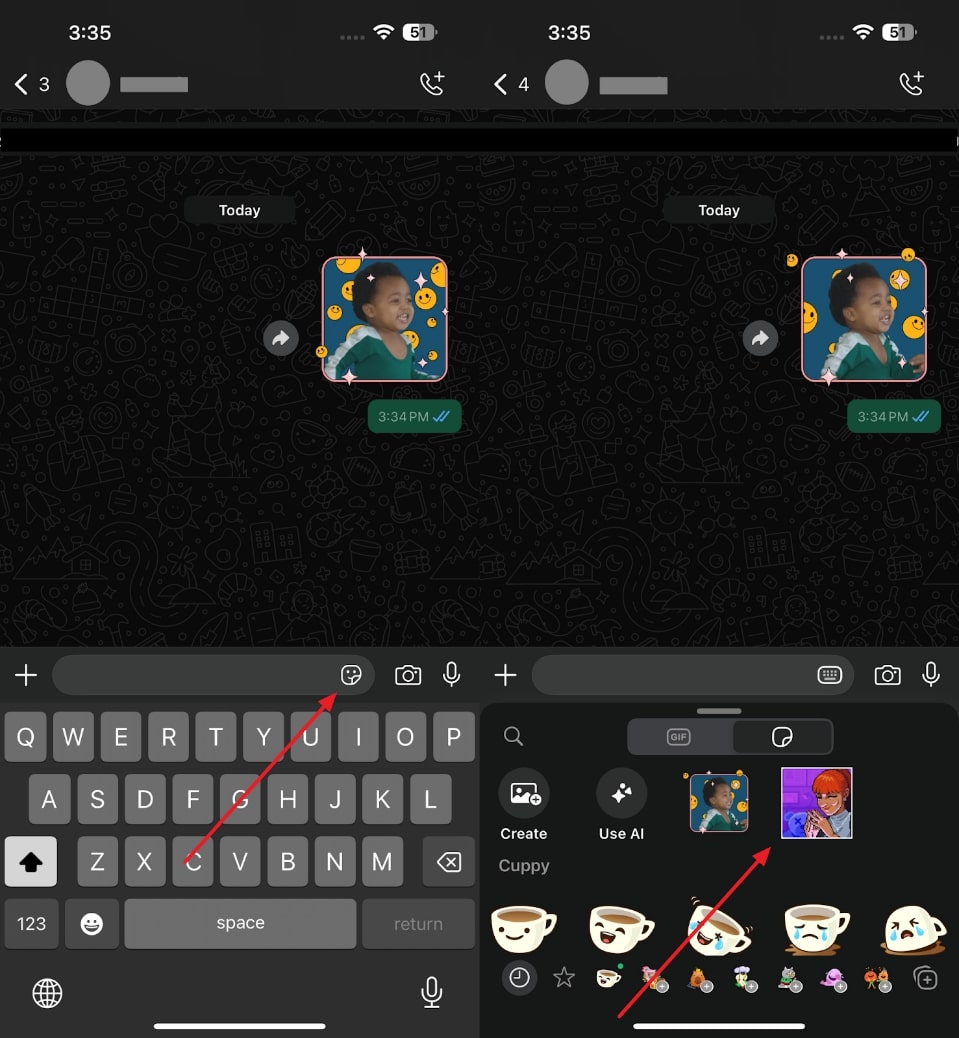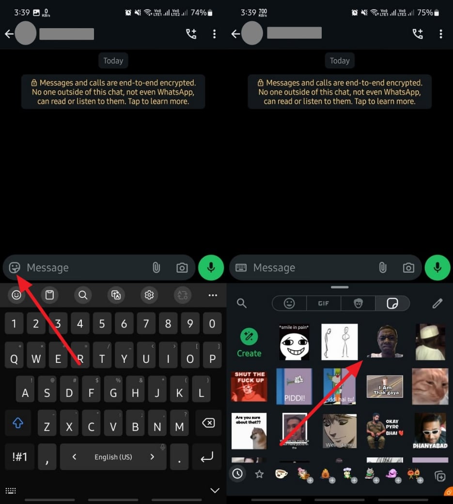 步骤1通过转到消息传递应用程序上的任何聊天屏幕来启动该过程。接下来,只需点击“贴纸”图标即可访问其庞大的收藏。然后,您需要点击要删除的贴纸至少几秒钟。