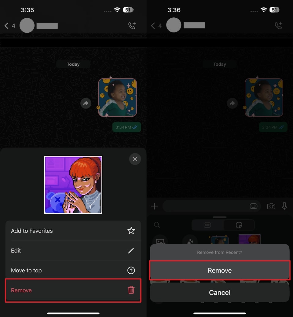 步骤2接下来,您将访问一个自下而上的菜单,您必须在其中使用“删除”选项。现在,点击“从最近删除”弹出窗口中的“删除”选项,永久删除您的贴纸。