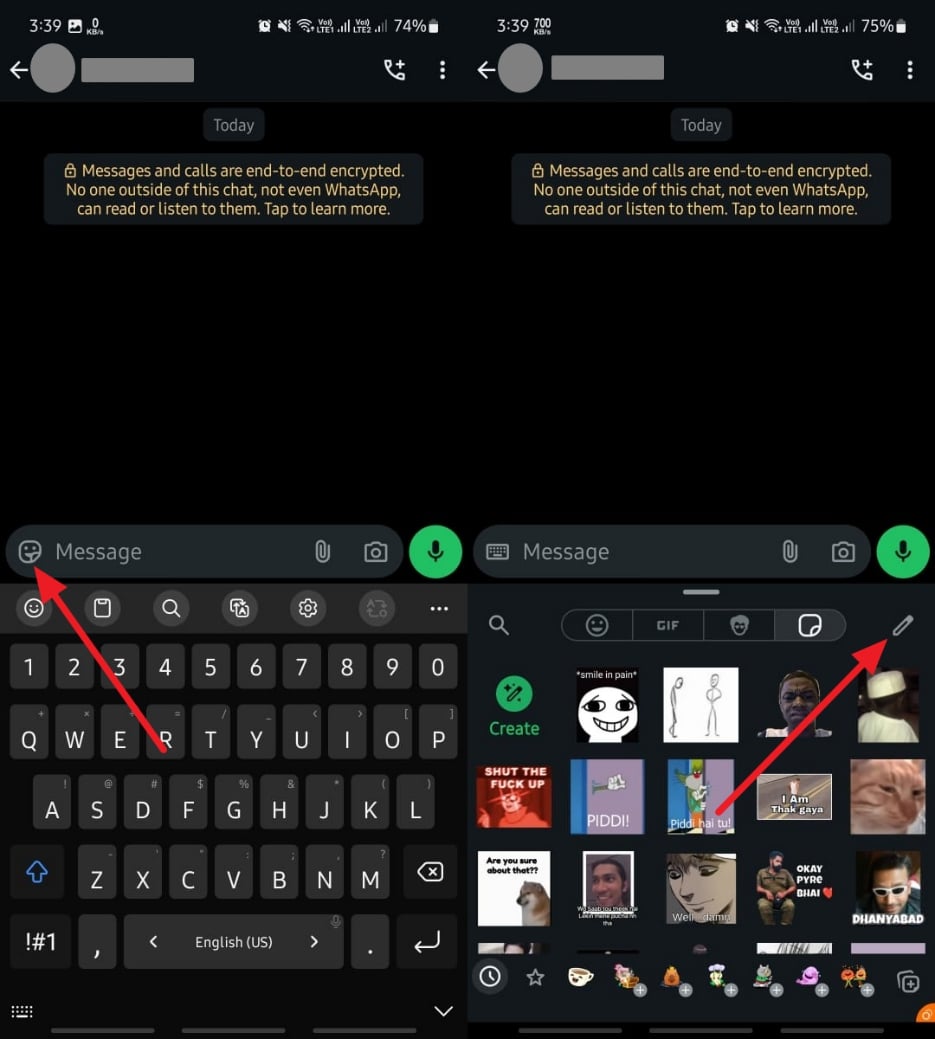 步骤1在您首选的移动设备上启动 WhatsApp 应用程序以启动该过程。打开它后,点击主屏幕上的任何聊天,然后选择聊天界面上的“贴纸”图标。当您看到贴纸库时,只需点击“铅笔”图标即可进一步移动。