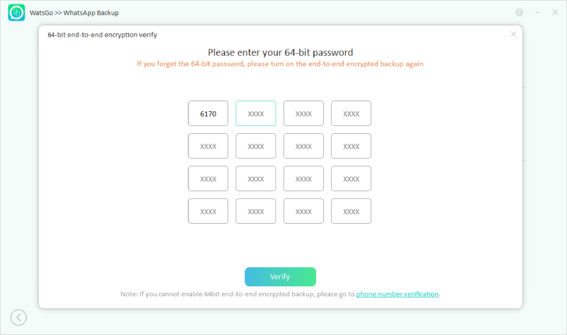 加密后,软件将开始创建和保存数据,在此过程中会弹出验证屏幕。要在 Android 设备上完成备份过程,请输入密码并按“验证”按钮。