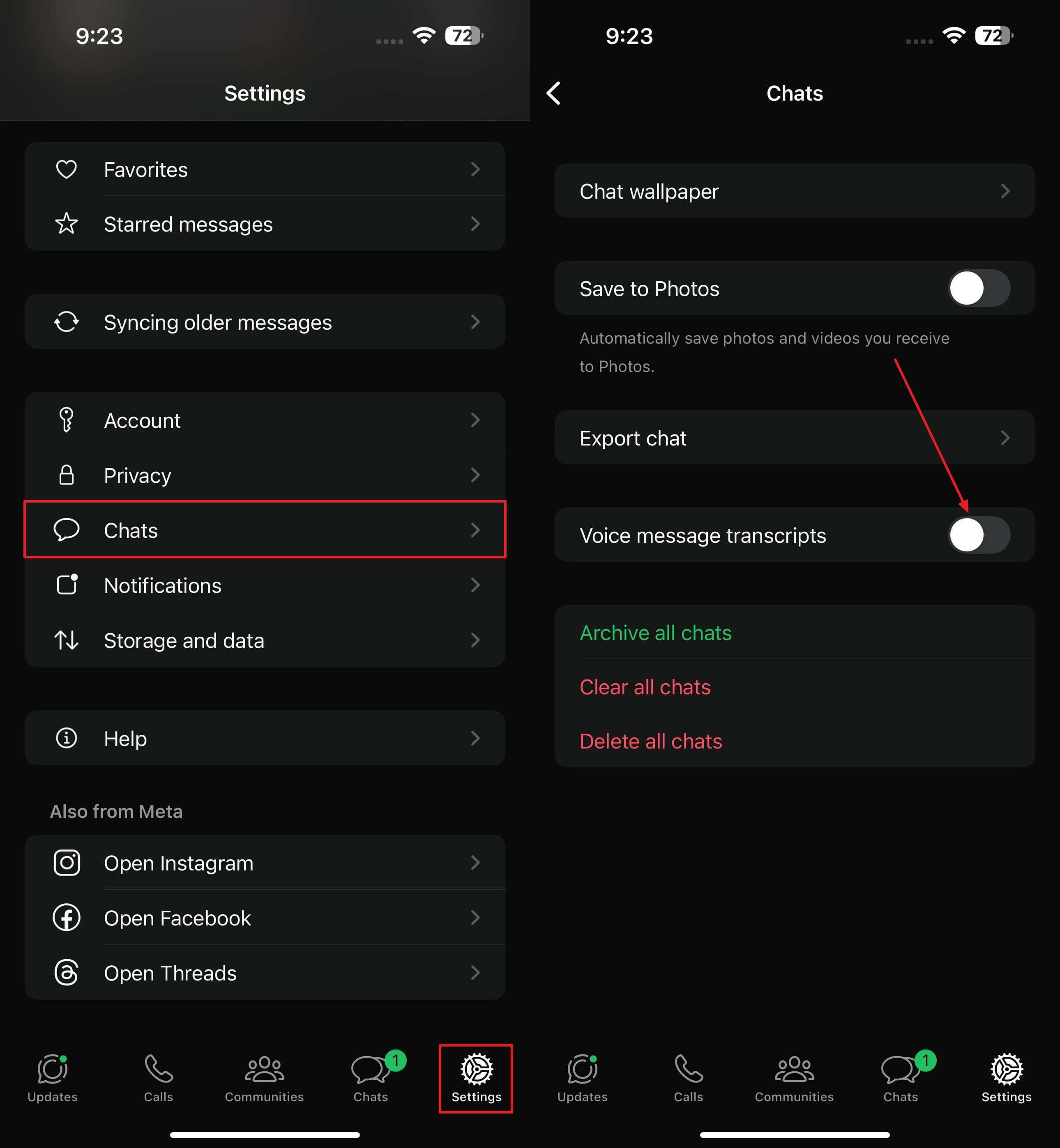步骤1在 iPhone 设备上打开 WhatsApp,然后从底部工具栏前往“设置”选项卡。现在,选择“聊天”选项并切换“语音消息转录”选项即可开始。