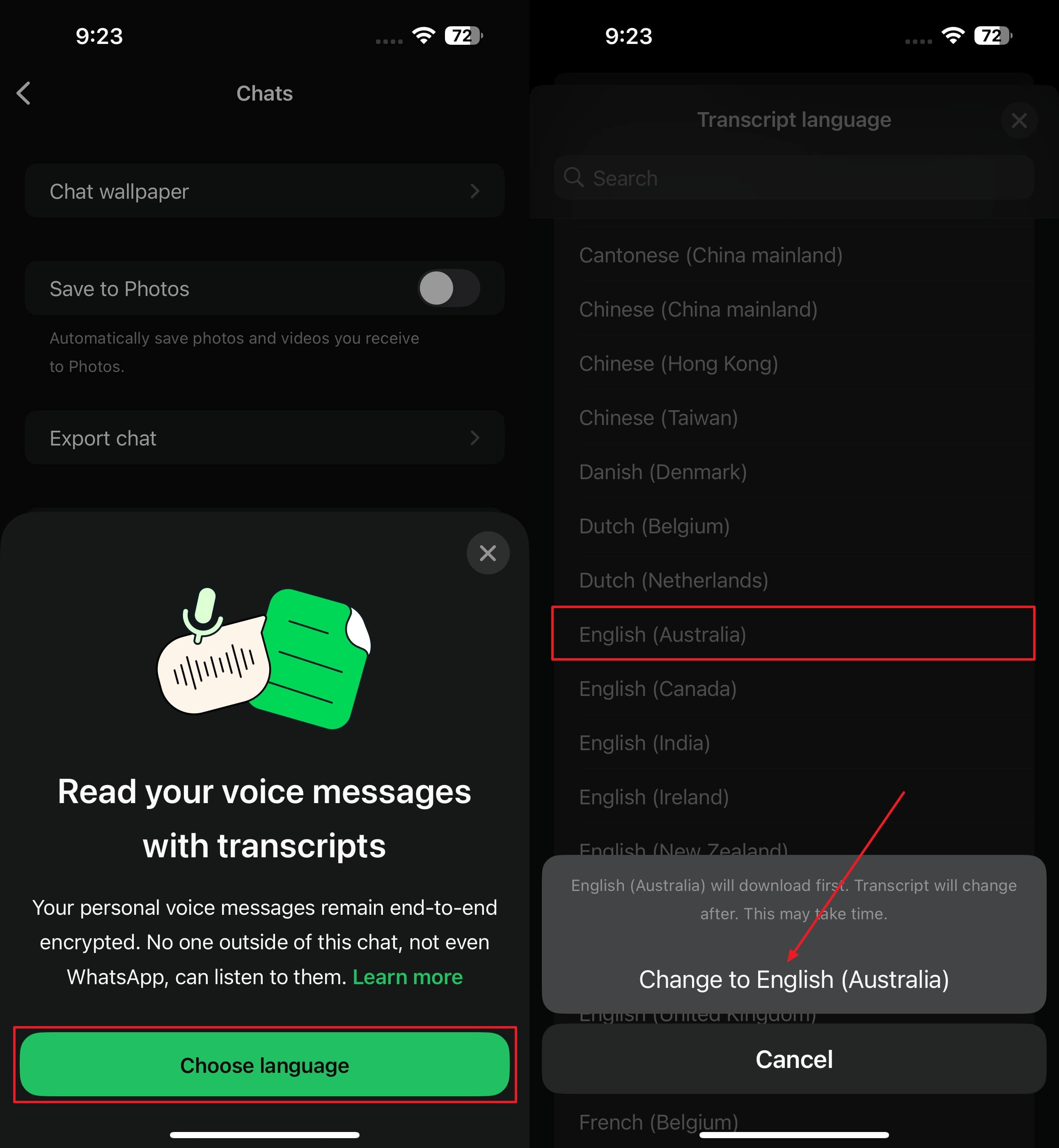 步骤2在“通过文字记录阅读您的语音消息”菜单中,按“选择语言”按钮以显示不同的语言。从这里,选择所需的语言,然后点击“立即设置”按钮下载它以进行转录。