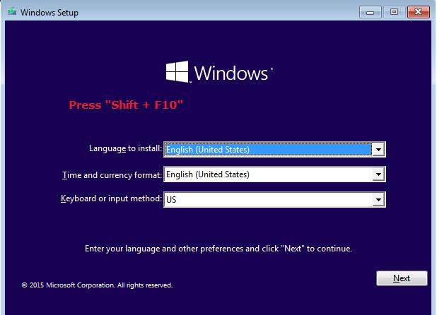 第7步:提出命令提示符当 Windows 进入安装磁盘屏幕时。您可以通过按转变和F10键在一起。