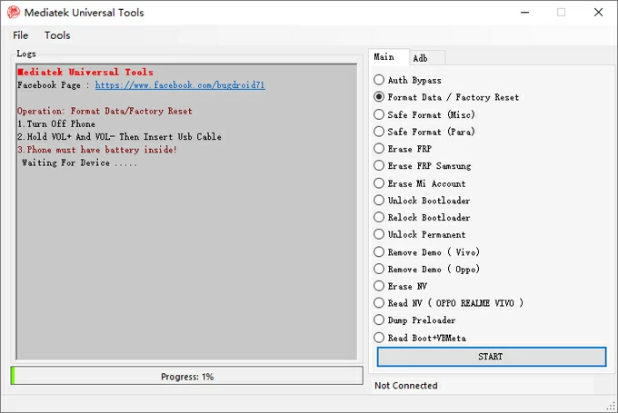 您可以免费使用 MediaTek Universal Tools,本部分重点介绍格式化数据/恢复出厂设置功能和擦除 FRP 功能,以解锁已锁定的 Android 手机。