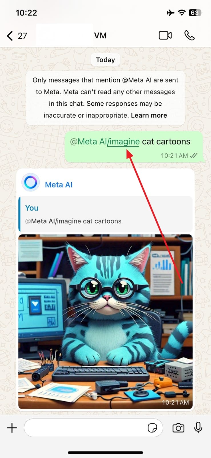 步骤1确保您的 WhatsApp 应用已更新到最新版本后,打开它以访问要在其中生成图像的聊天。在这里,输入“@”并选择“Meta AI”以运行带有前缀“Imagine”的所需提示。
