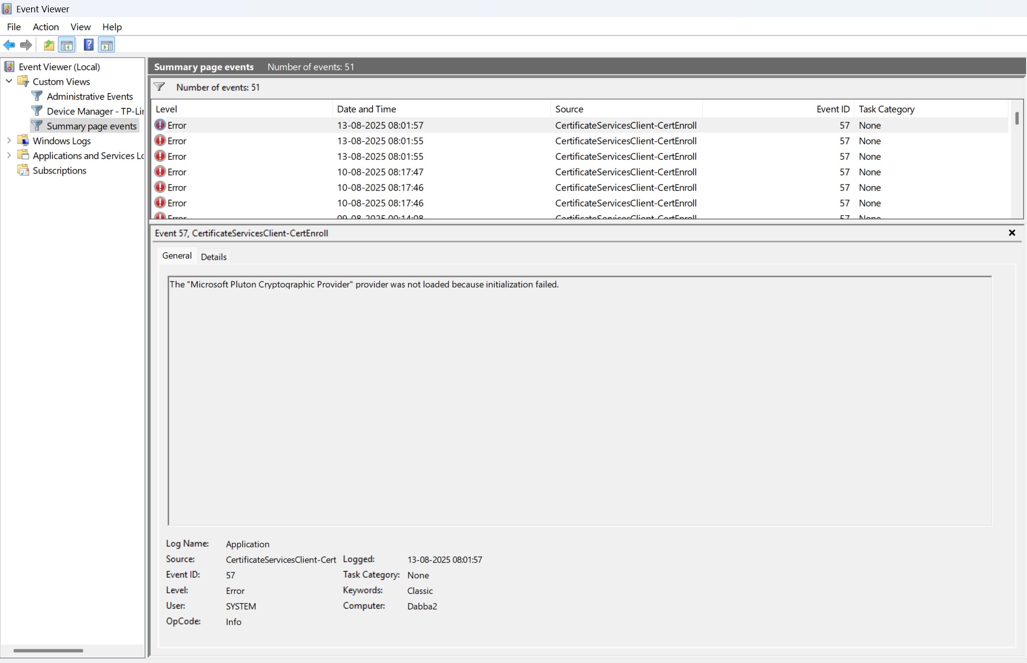 此问题不会影响任何活动的应用程序,但当您检查事件查看器日志时,您会发现一个条目错误 ID 57。打开日志后,你会发现“由于初始化失败,未加载“Microsoft Pluton Cryptographic Provider”提供程序。”信息。