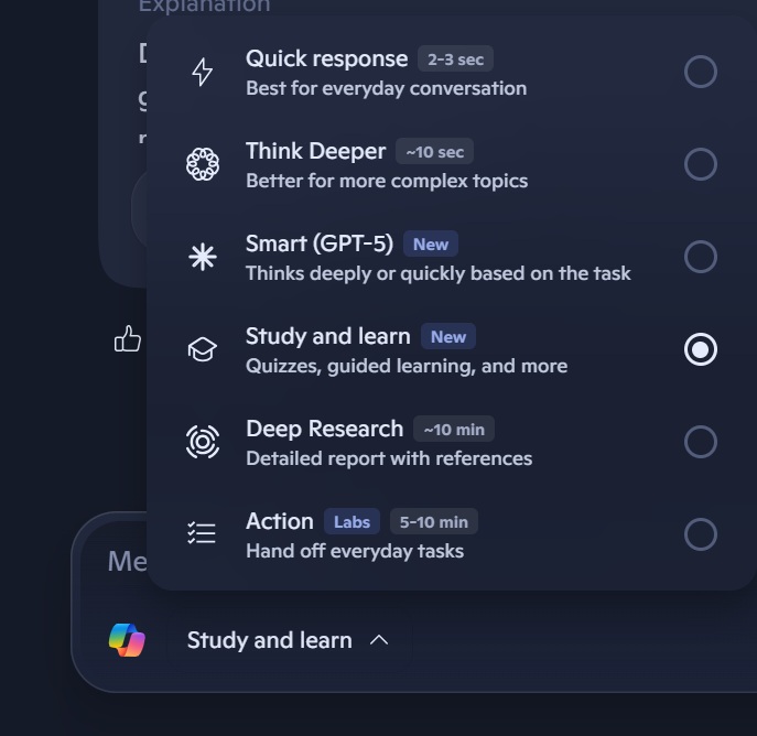 如您在上面的屏幕截图中看到的那样,Copilot一起处理了三个文件并创建了一个测验。我可以在副本接口中选择选项,然后AI随后进行得分。此外,它提供了解释。