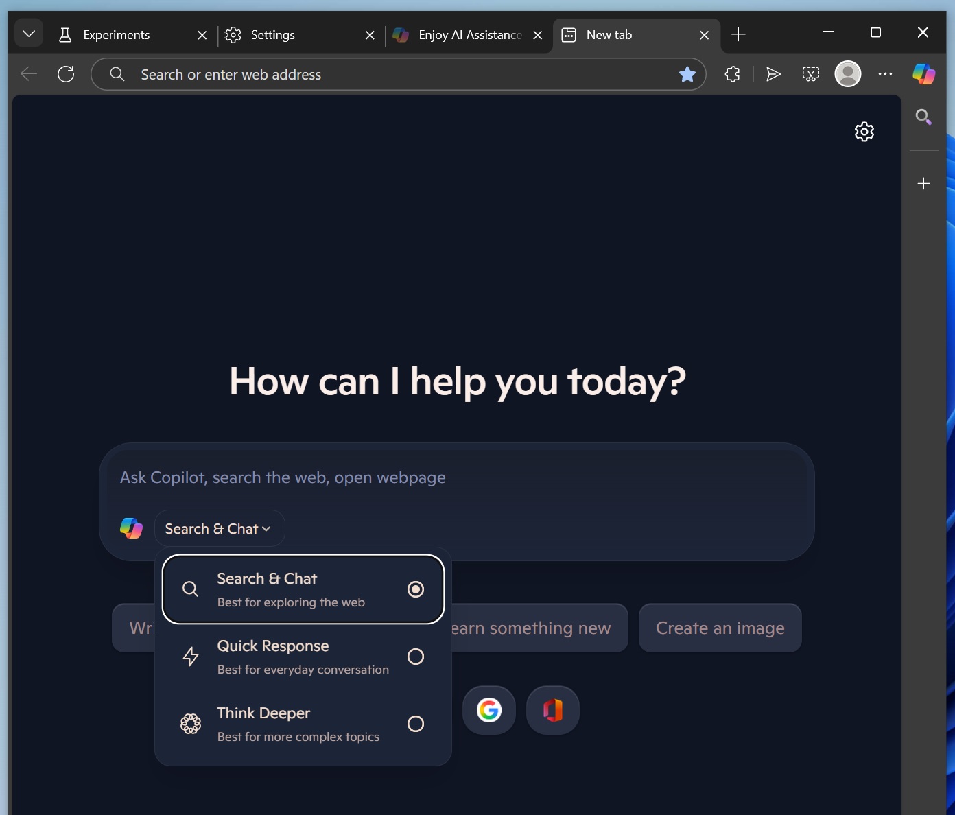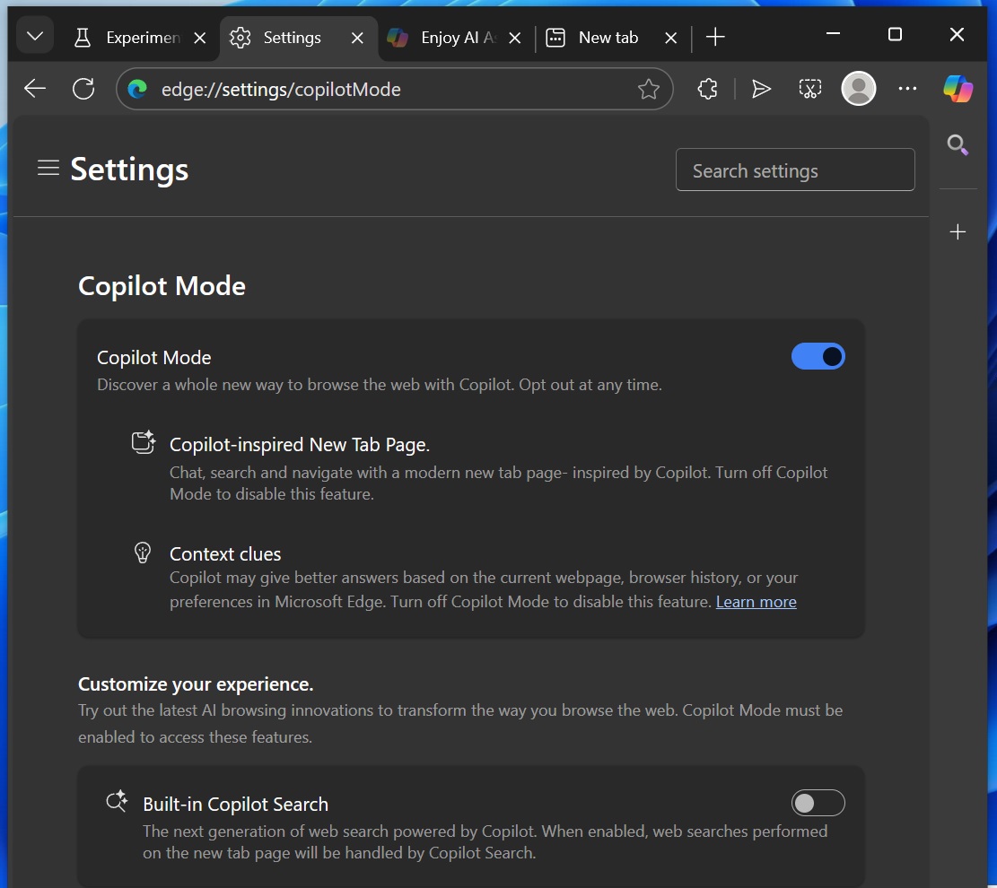 “使用受 Copilot 启发的现代新标签页进行聊天、搜索和导航。关闭 Copilot 模式即可禁用此功能,”微软指出。