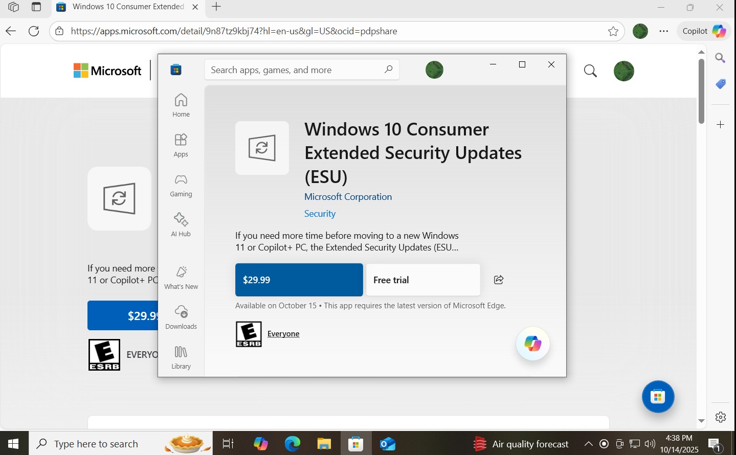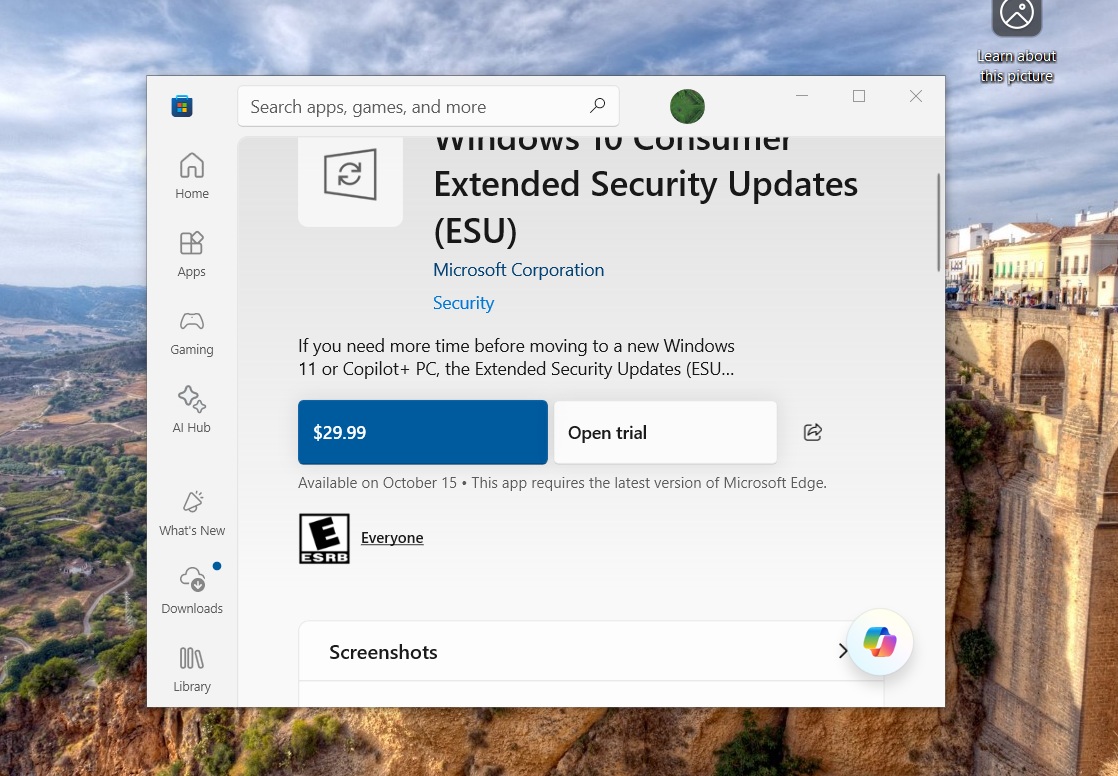 “如果您在迁移到新的 Windows 11 或 Copilot+ PC 之前需要更多时间,扩展安全更新 (ESU) 计划将在 2026 年 10 月 13 日之前帮助保护您的 Windows 10 设备,”微软描述了该扩展。