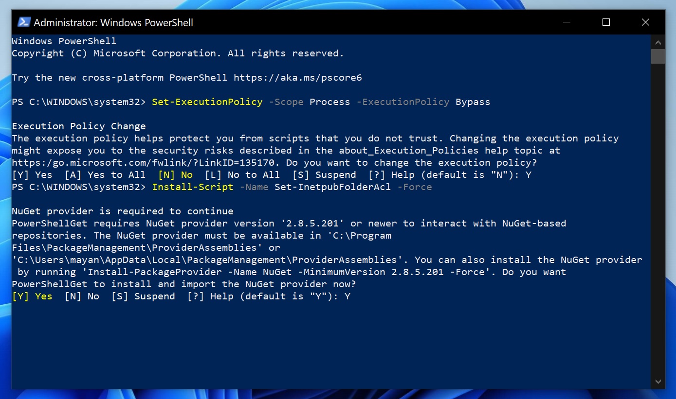 - 在某些情况下(比如我的),系统会要求您安装“NuGet 提供程序” 当它不存在时。只需回复“是”继续,并运行上面的“安装脚本“ 再次。