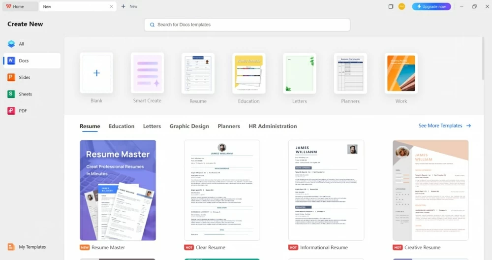 WPS 编写器:模板存储是 WPS Writer 最好的功能之一。它具有简历、名片、发票、日历等模板。它具有一系列使其脱颖而出的内置实用程序,例如 Resume Master、PDF 编辑器、OCR、合并/拆分文档和电子签名。所有这些工具都可以在一个小程序中使用,无需任何插件。