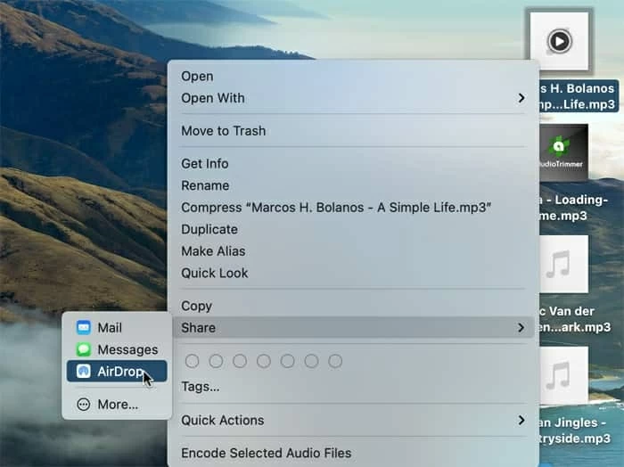 导航到桌面上的 MP3 文件或 Mac 中的任何文件夹。右键单击它并选择“共享”,然后选择“AirDrop”。选择您的 iPhone 作为您想要向其发送音乐文件的收件人。然后在 iPhone 上点击接受并保存歌曲。