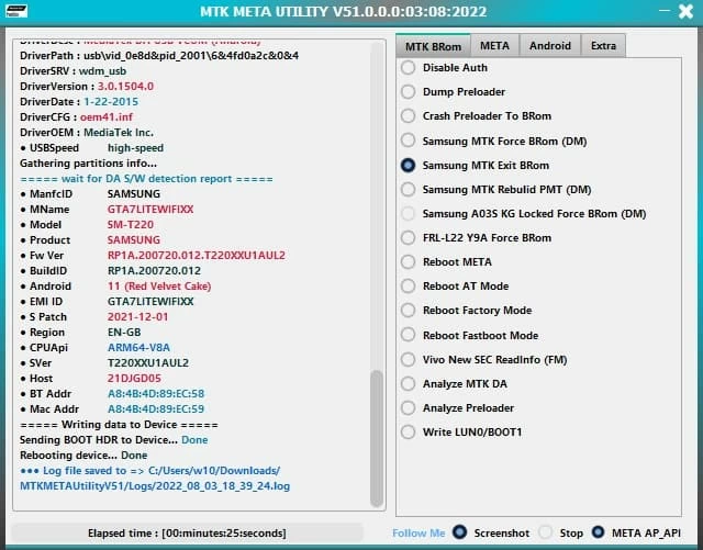 MTK Meta Utility Tool 是一款主要用于 MediaTek (MTK) 芯片组设备的软件程序。它具有多种功能,例如固件刷新、安全锁旁路以及基于 MTK 的智能手机和平板电脑的设备维修。这些高效的功能使 MTK Meta Utility Tool 成为 Android 解锁的强大 FRP 绕过工具,特别是对于三星设备。