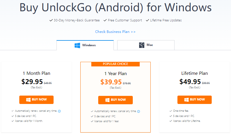 步骤一:访问iToolTab UnlockGo (Android)购买页面。选择一个计划并单击“立即购买”。如果您需要解锁超过 5 台设备,请点击“查看业务计划”并选择适合您的设备。