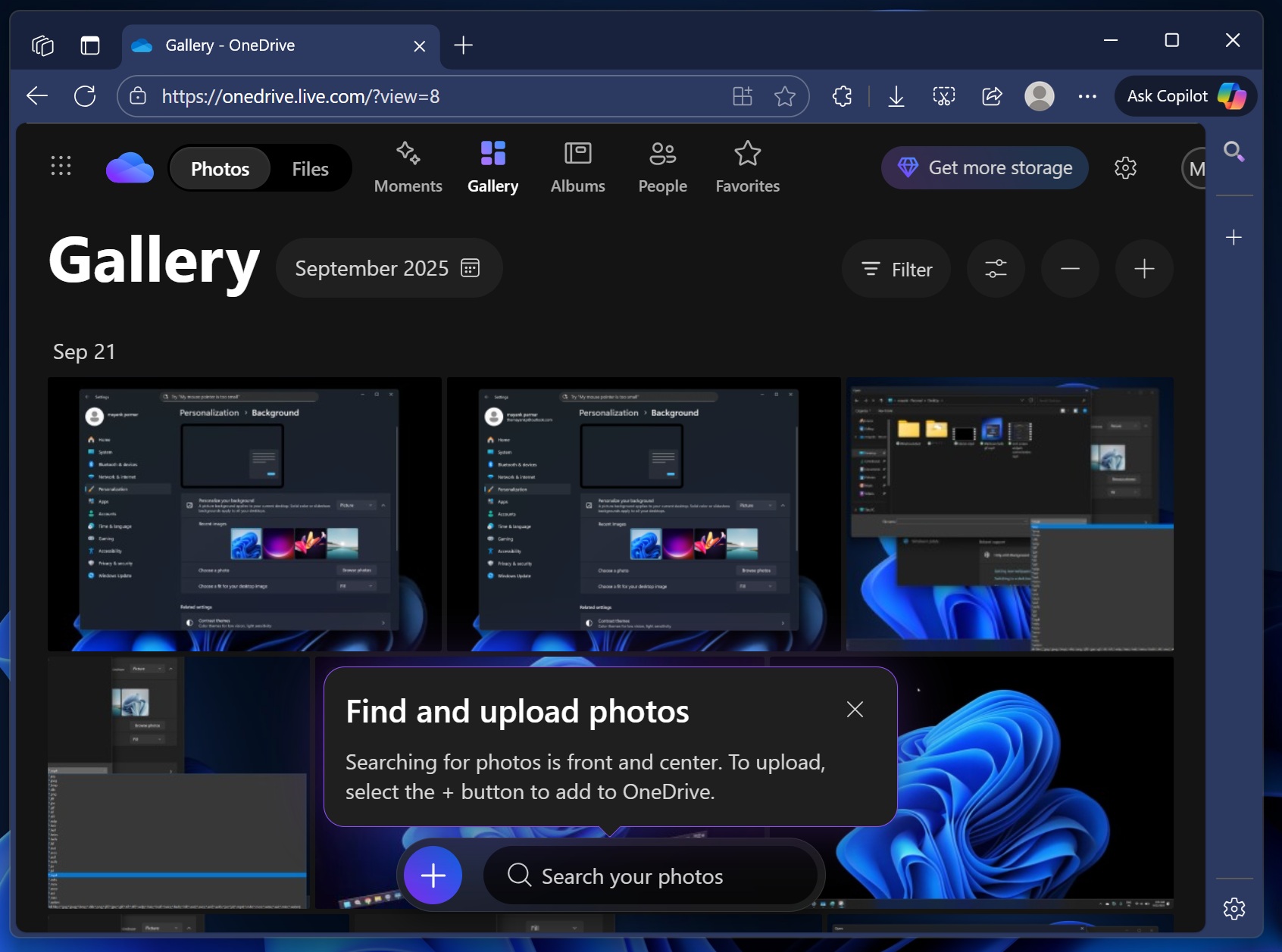 动画很流畅,弹出窗口很漂亮,微软终于找到了最好的颜色组合。底部有一个浮动搜索栏,以及一个将更多照片上传到 OneDrive 的选项。