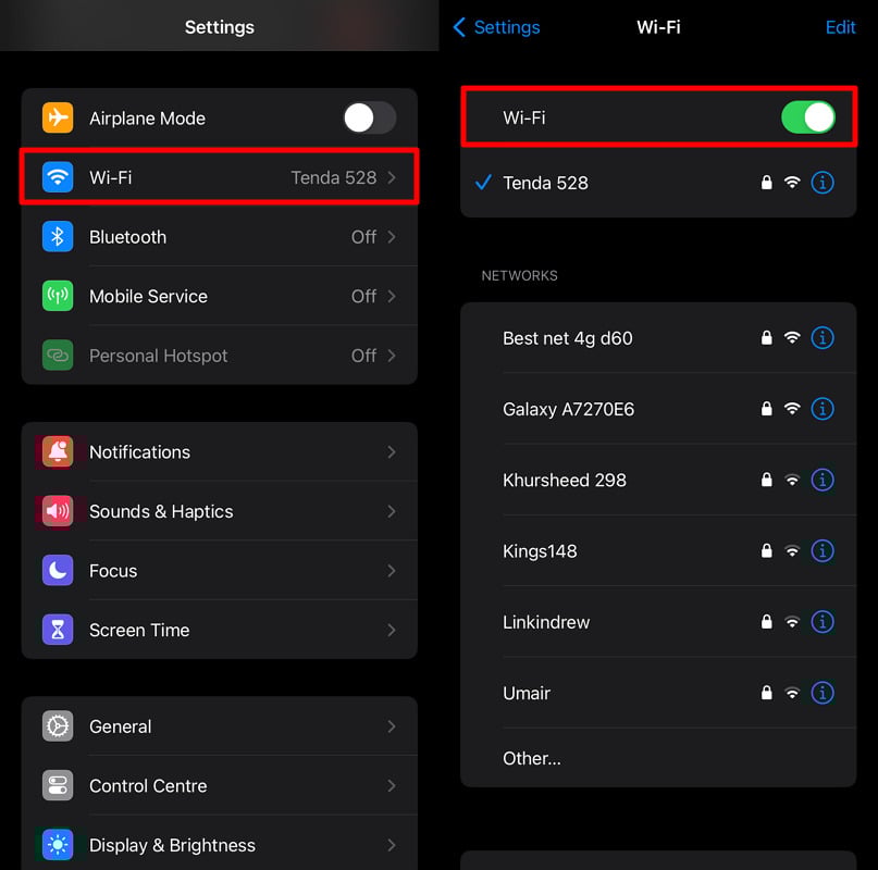 对于Wi-Fi:打开iPhone的“设置”应用程序后,查找“ Wi-Fi”选项并点击它。然后,确保其切换按钮已打开,并连接到稳定的网络提供商。