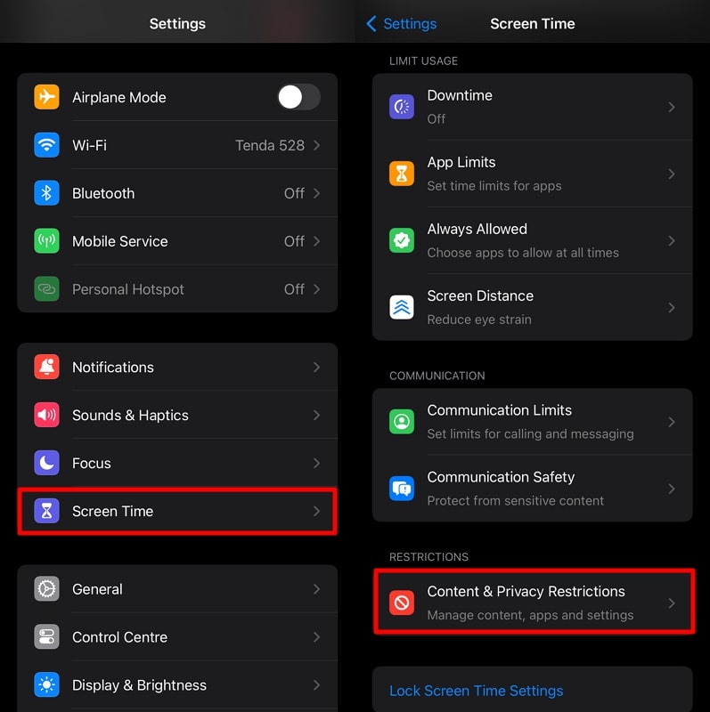 步骤1从“设置”中,通过点击“设置”并访问“屏幕时间”选项。然后,在“限制”部分中选择“内容和隐私限制”选项以查看其设置。