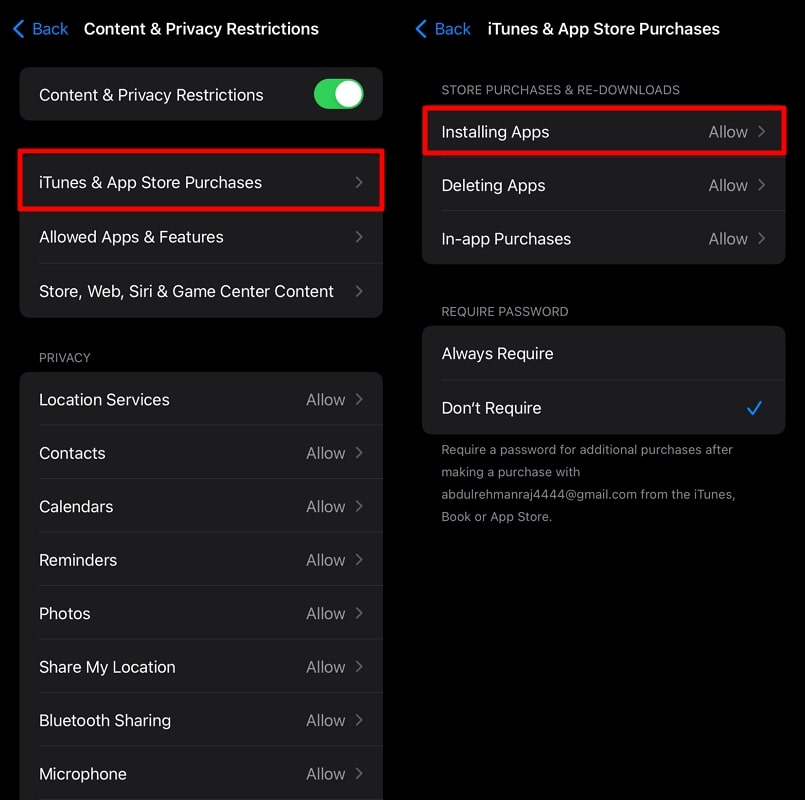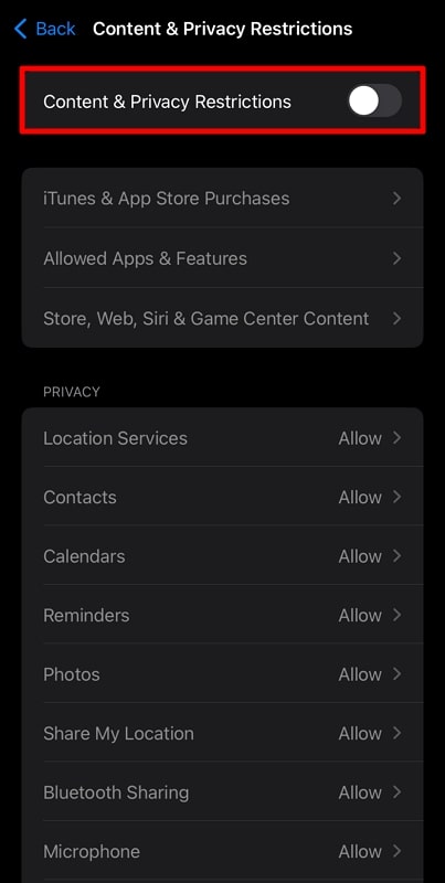 步骤3那些应用此调整步骤并仍然面临限制的人可以暂时禁用“内容和隐私限制”服务。只需转到其页面并关闭按钮,这将删除所有限制,并允许您测试应用程序安装是否有效。