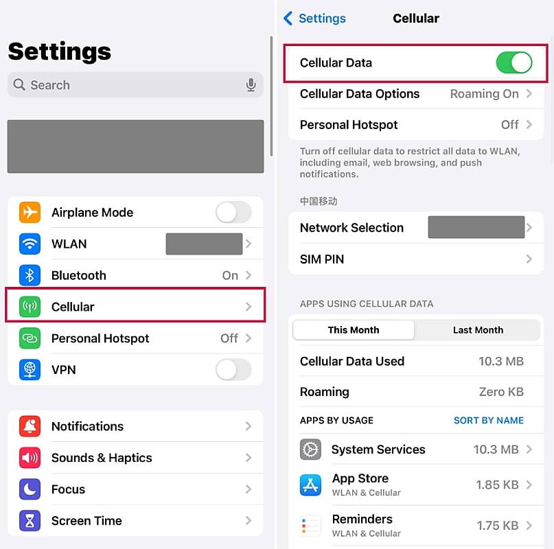 用于细胞数据:从“设置”应用程序中,可以达到“蜂窝数据”选项,并确保将此功能打开,并且您具有足够的信号强度来实现SIMP。