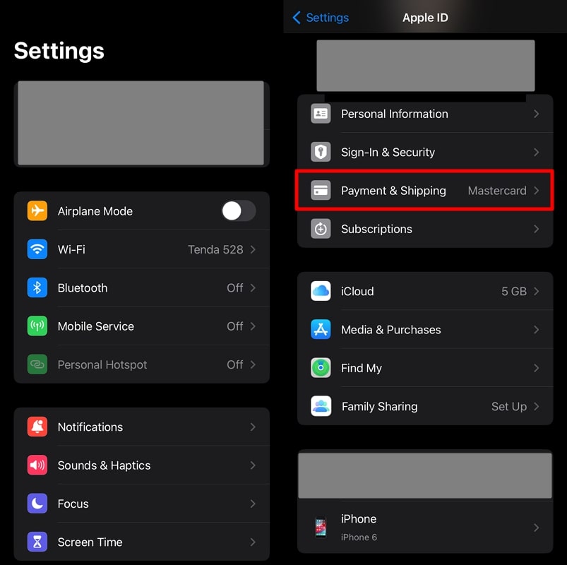步骤1输入iOS智能手机的“设置”应用程序后,点击上面显示的“ Apple ID”名称以访问其详细信息。在那里,找到并选择“付款和运输”选项,要求您进行身份验证。