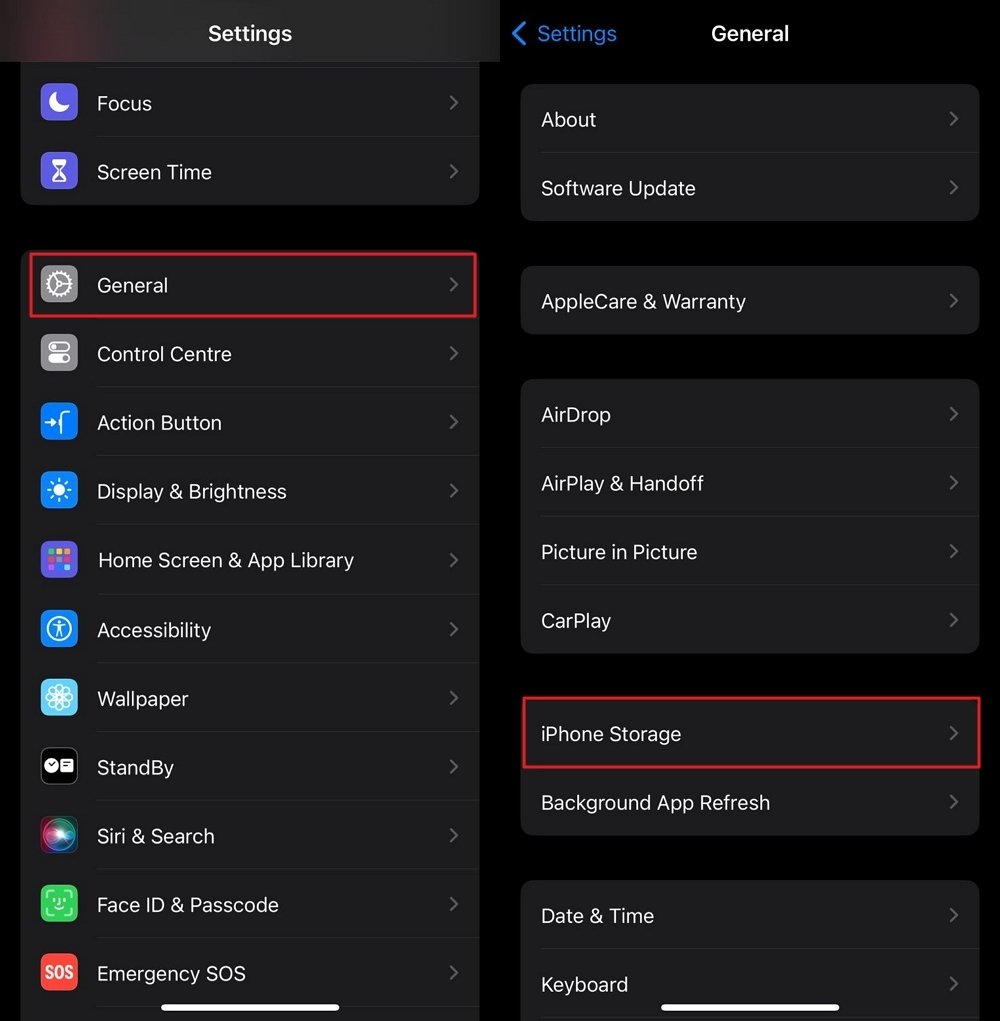 指示:进入iOS智能手机的“设置”应用程序,然后进入“常规”设置。在这里,向下滚动并点击“ iPhone存储”选项,以检查所有应用程序所采集的存储以及剩下多少存储。