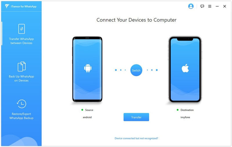 传输器是另一个 WhatsApp 工具,可让您轻松地在设备之间传输大文件。它对操作系统没有限制,因此可以用于 android 和 ios 设备。此外,您通过 iTransor for WhatsApp 创建的备份不会被覆盖,因此如果您丢失了一些聊天记录,您可以将旧备份恢复到手机上。
