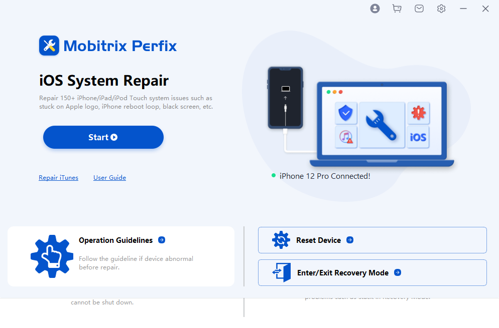 启动 Mobitrix Perfix,点击“开始”按钮 >立即修复。您可以通过我们的用户指南查看更多详细信息。