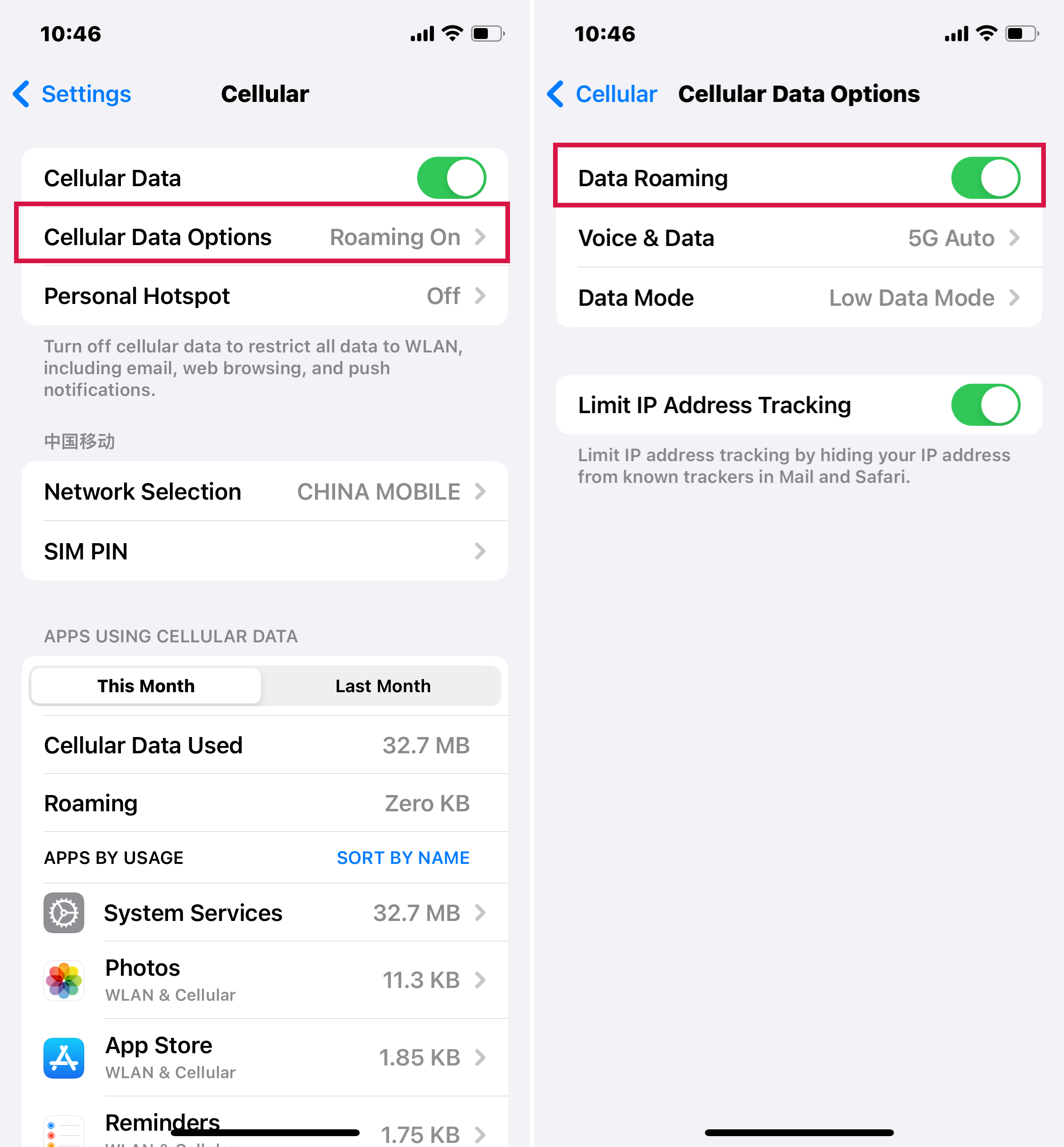 导航至“设置”>蜂窝网络> 蜂窝数据选项 >数据漫游。