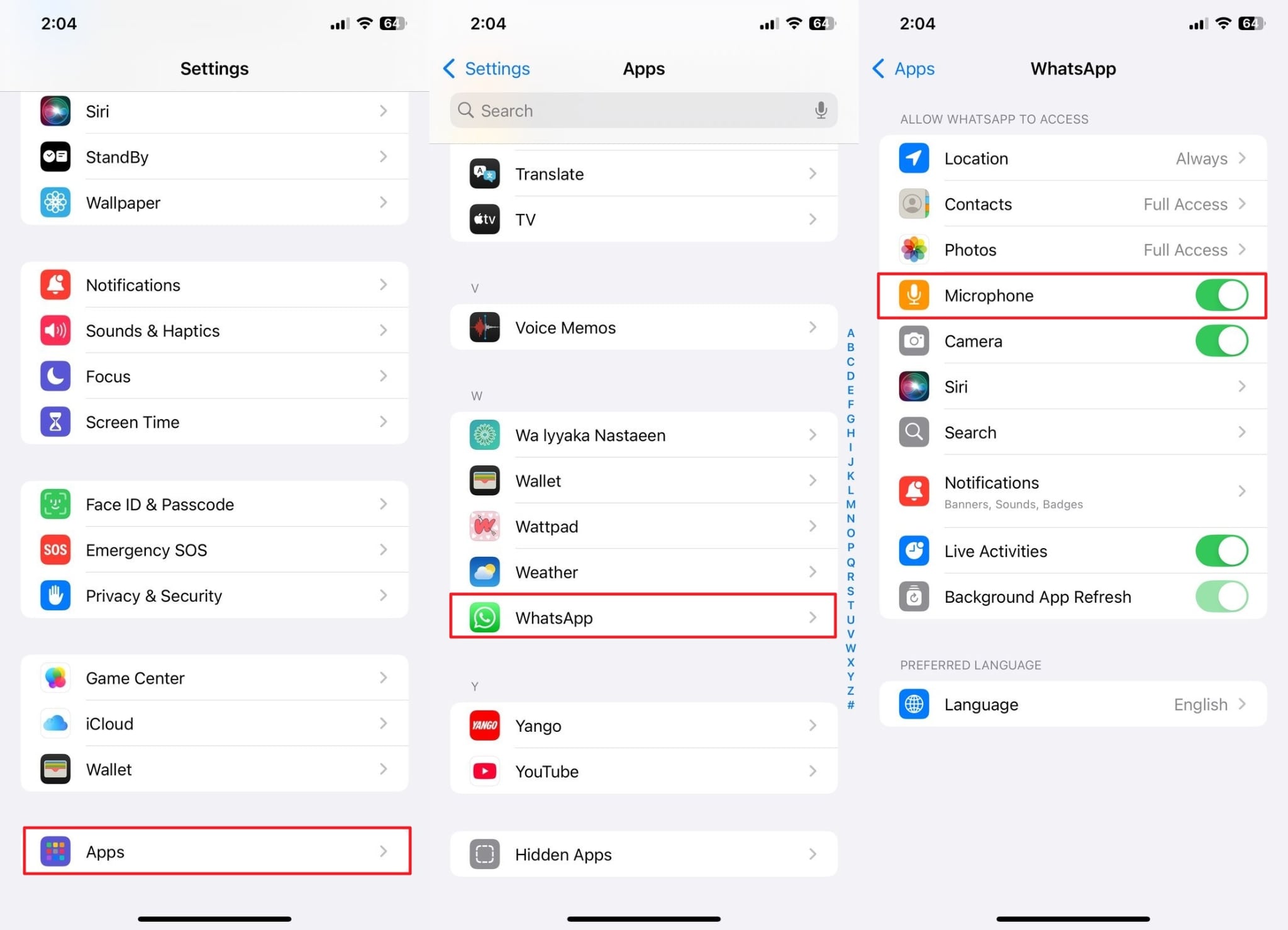 指示:在 iPhone 的“设置”中,滚动到页面底部找到“应用程序”选项。要显示 WhatsApp 设置,请选择“W”类别下的“WhatsApp”选项。要查看问题是否已解决,请尝试从“允许 WhatsApp 访问”部分打开或关闭“麦克风”开关。