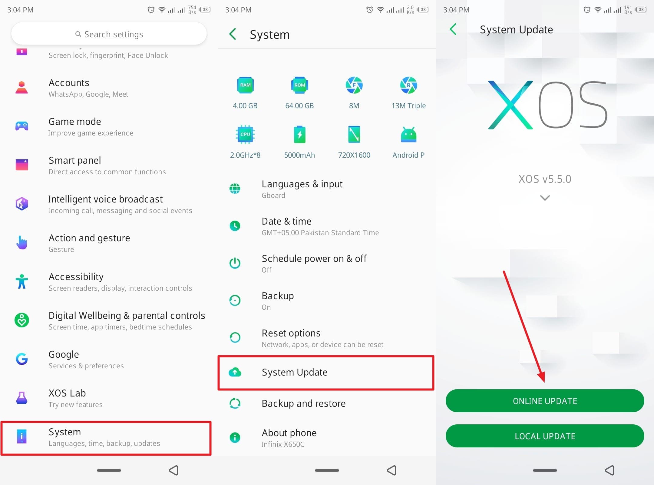 指示:转到 Android“设置”应用程序的末尾,然后选择“系统”选项。然后,按“系统更新”选项,出现以下两个选项:在线更新和本地更新。