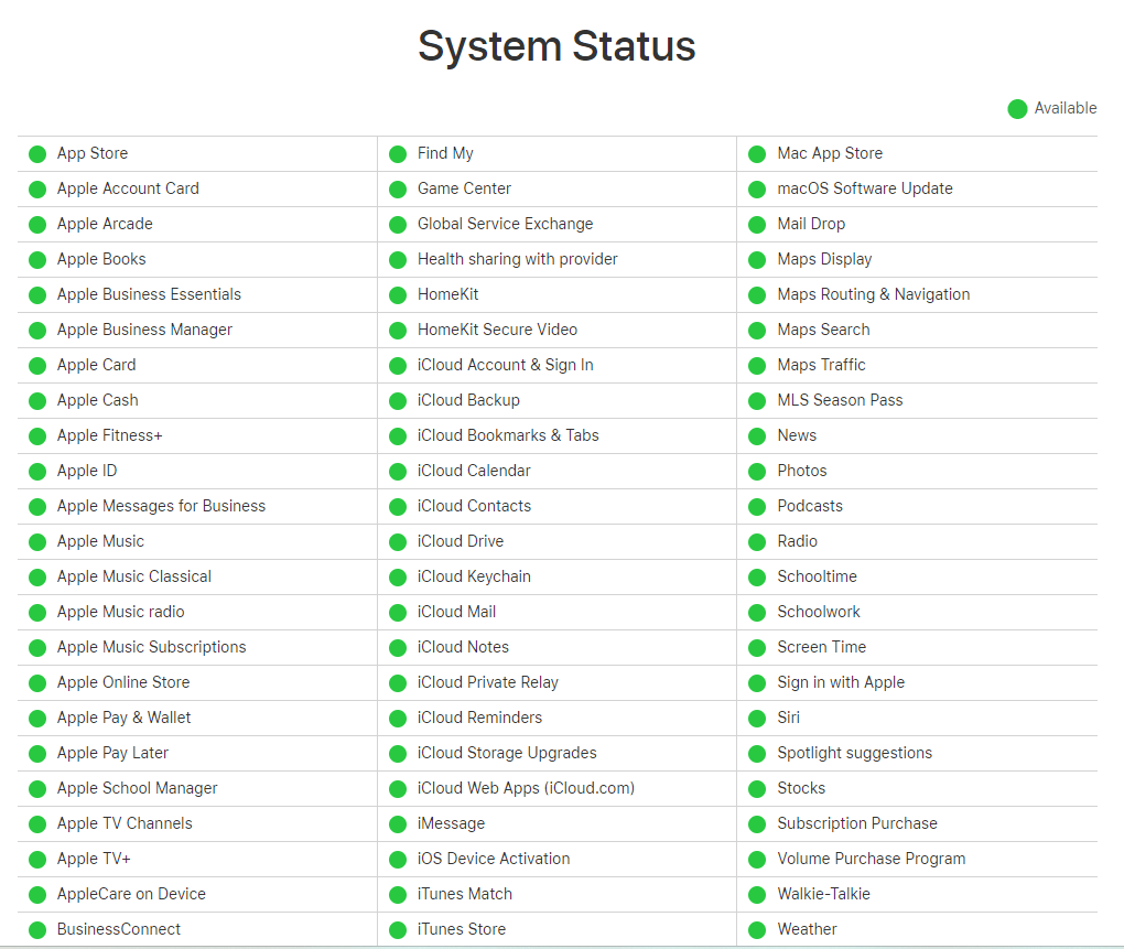 - 参观Apple 系统状态网页。此页面提供有关各种 Apple 服务状态的实时信息,包括 iOS 设备更新。