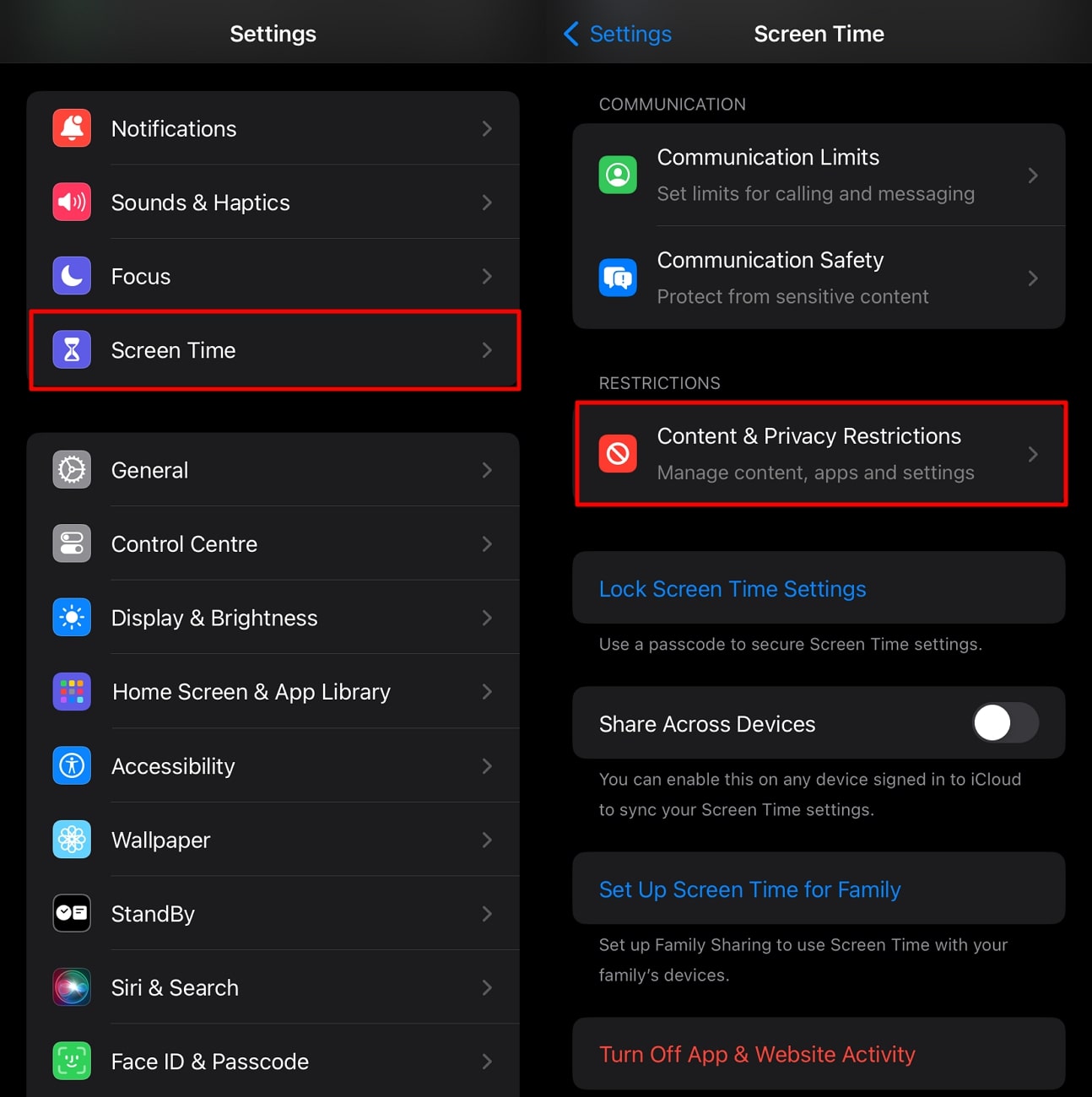 步骤1首先,点击 iOS 移动设备上的主“设置”图标,然后导航至“屏幕时间”选项。然后,向下滚动并从列表中选择“内容和隐私限制”选项。
