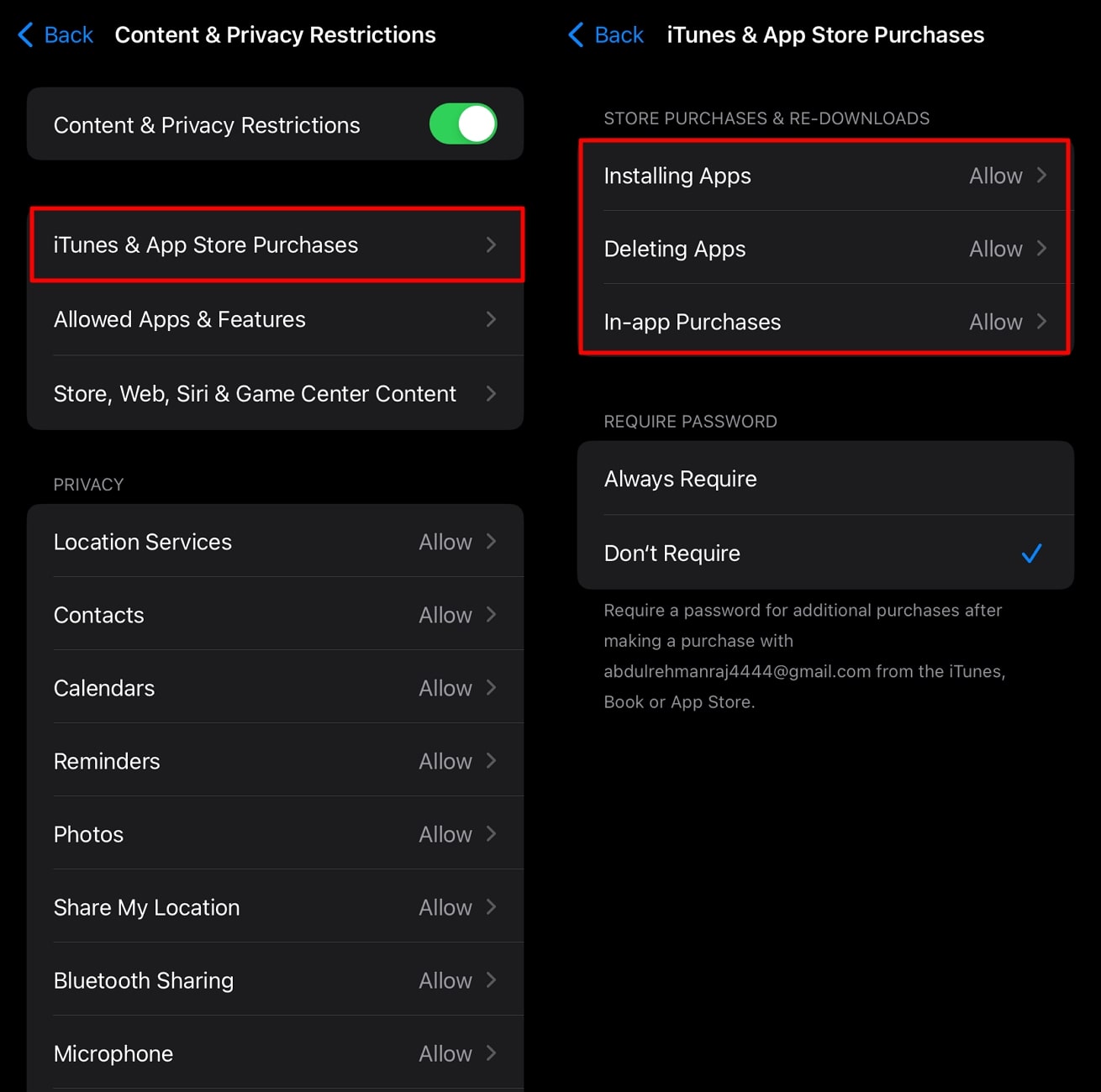 步骤2接下来,确保其已打开,然后点击“iTunes 和 App Store 购买”选项。在那里,检查设置并将所有选项设置为“允许”以确保正常运行。