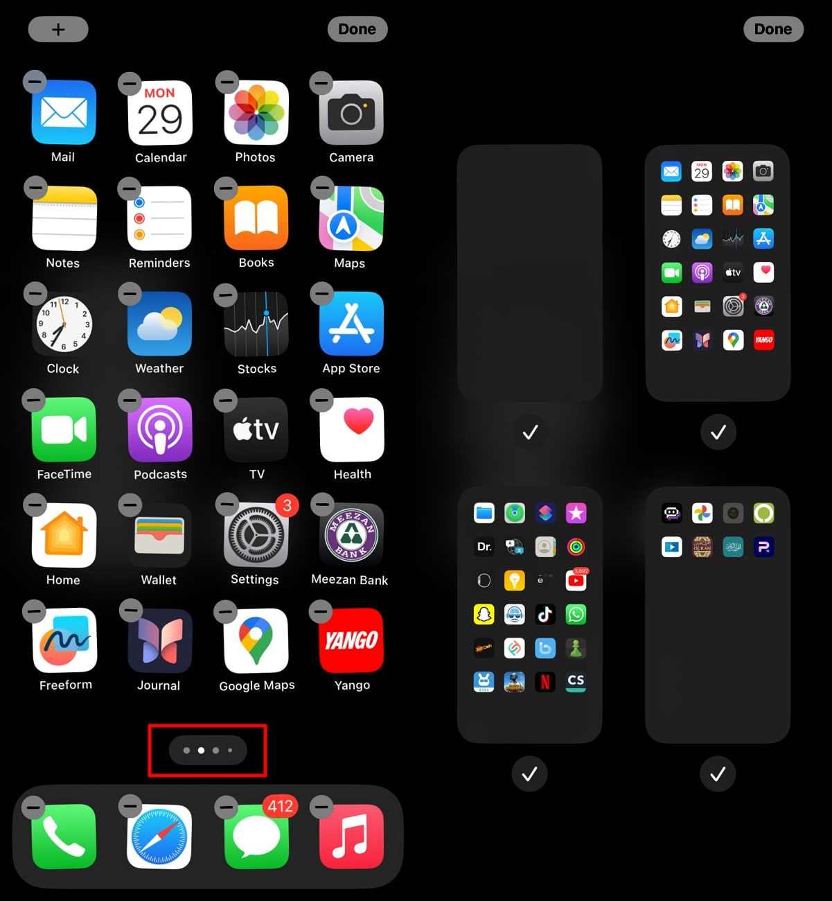 指示:首先按 iPhone 主页上的任何空白区域并按住它,直到所有应用程序开始抖动。然后,点击屏幕底部显示的代表主屏幕页面的“点”。最后,点击复选标记框,确保所有所需页面下方都带有复选标记。