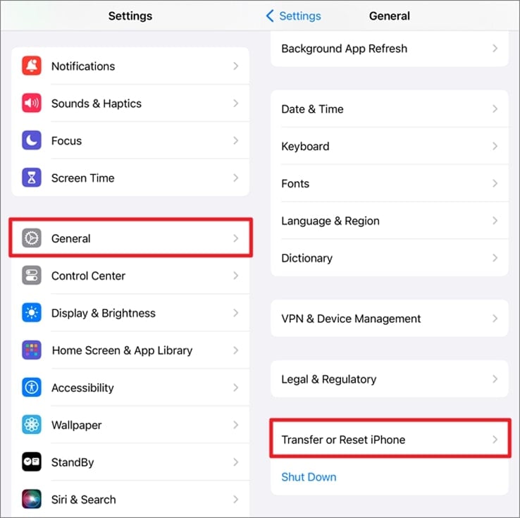 步骤1首先通过 iOS 手机的“设置”应用程序进入“常规”类别。然后,向下移动显示屏以进入“传输或重置 iPhone”功能。