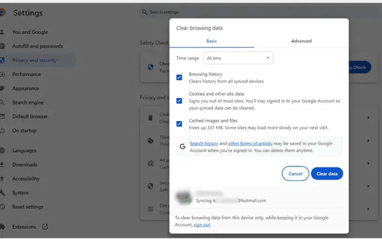 步骤2:寻找要求您删除缓存和 cookie 的选项。