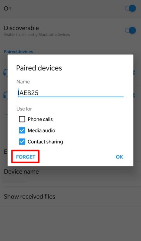 步骤1首先,打开 OnePlus 手机的“设置”并从那里进入“蓝牙”功能。然后,找到您遇到问题的设备并点击其名称。将出现一个新的弹出窗口,您必须点击“忘记”选项才能成功取消配对。