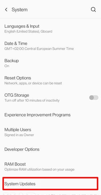 步骤1首先,进入 OnePlus“设置”并进入“系统”选项。然后,直接进入“系统更新”选项,您可以在其中检查新更新。