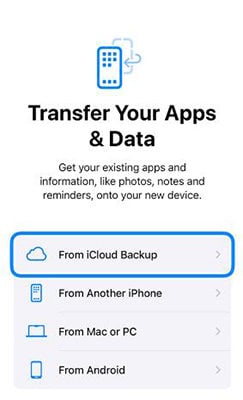 - 按照屏幕上的说明开始设置您的 iPhone。当您到达“转移您的应用程序和数据”屏幕,选择“从 iCloud 备份恢复”。