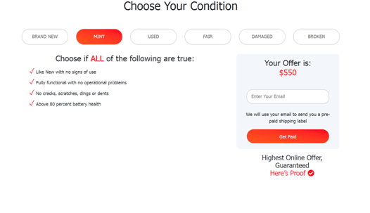 此外,Target 只给你两个选择:工作或不工作。借助 Buyback Boss,您可以从六种不同的选项中进行选择,包括您的 iPhone 是否损坏或损坏的情况。这可能会相差数百美元,具体取决于您的 iPhone 型号。