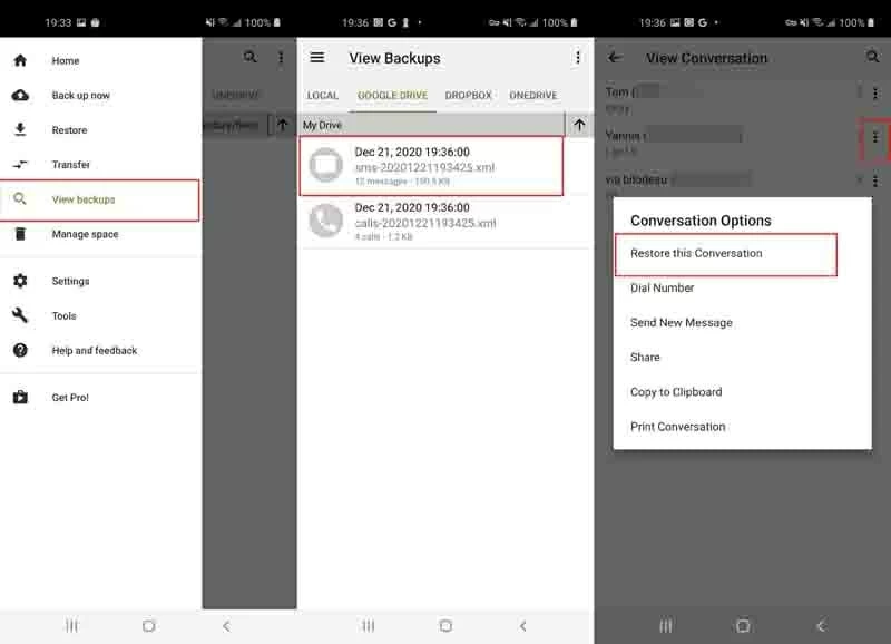 如果您需要从 Android 恢复特定对话或与某一特定联系人的消息,请导航至菜单>查看备份加载备份文件中包含的对话。当您找到要恢复的对话时,点击右侧以三个点表示的图标,然后选择恢复此对话。
