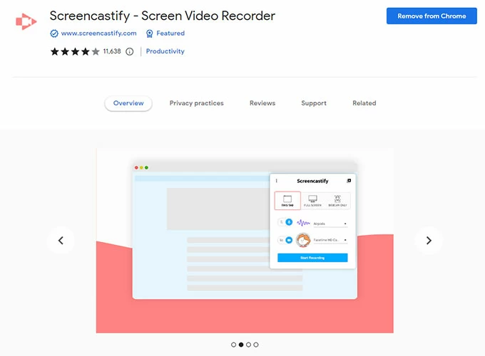 Screencastify 屏幕录像机可从 Chrome 网上商店获取,是一款轻量级 Chrome 浏览器扩展,安装简单并可直接在浏览器中运行。这个 Chrome 插件让创建截屏视频、网络研讨会和视频变得非常容易。它可以选择将这些视频转换为 GIF,可以插入到 Slack 或电子邮件中。借助其自动保存功能,您甚至可以将录制的视频保存到 Google Drive 并分享到 Google Classroom - 那些寻找简单的屏幕录像机来创建视频捕获以与同事或学生分享的人可能会对 Screencastify 感到满意。